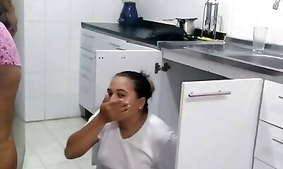 In a kitchen a sexy brunette playing with her big milk cans