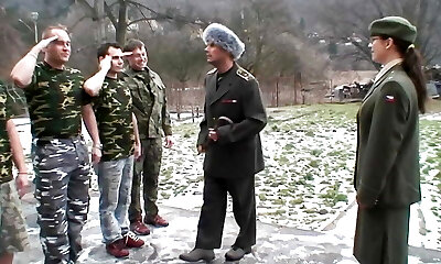 Gang-fuck for a hot brown-haired thirsty for sex and hot cum in a