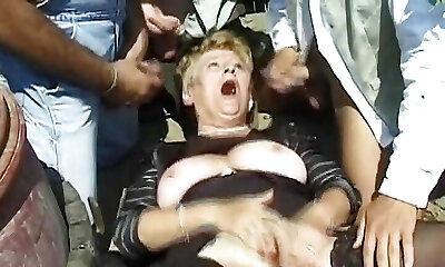 Wild German lady gets fucked by three stiff and loaded stiffys outdoors