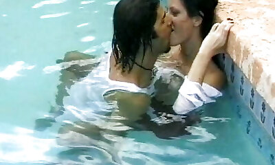 Busty and superb classic hot damsels by the pool get into each other