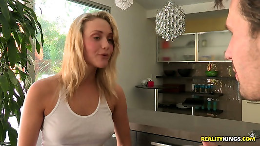 Slutty platinum-blonde seduces her brothers acquaintance and bangs him in a bathroom