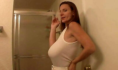 Classic huge-boobed porn queen sucks huge cock in the shower then fucks