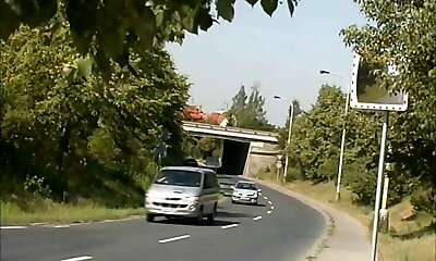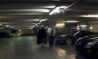 Beautiful classic busty platinum-blonde in the car gives head to her man